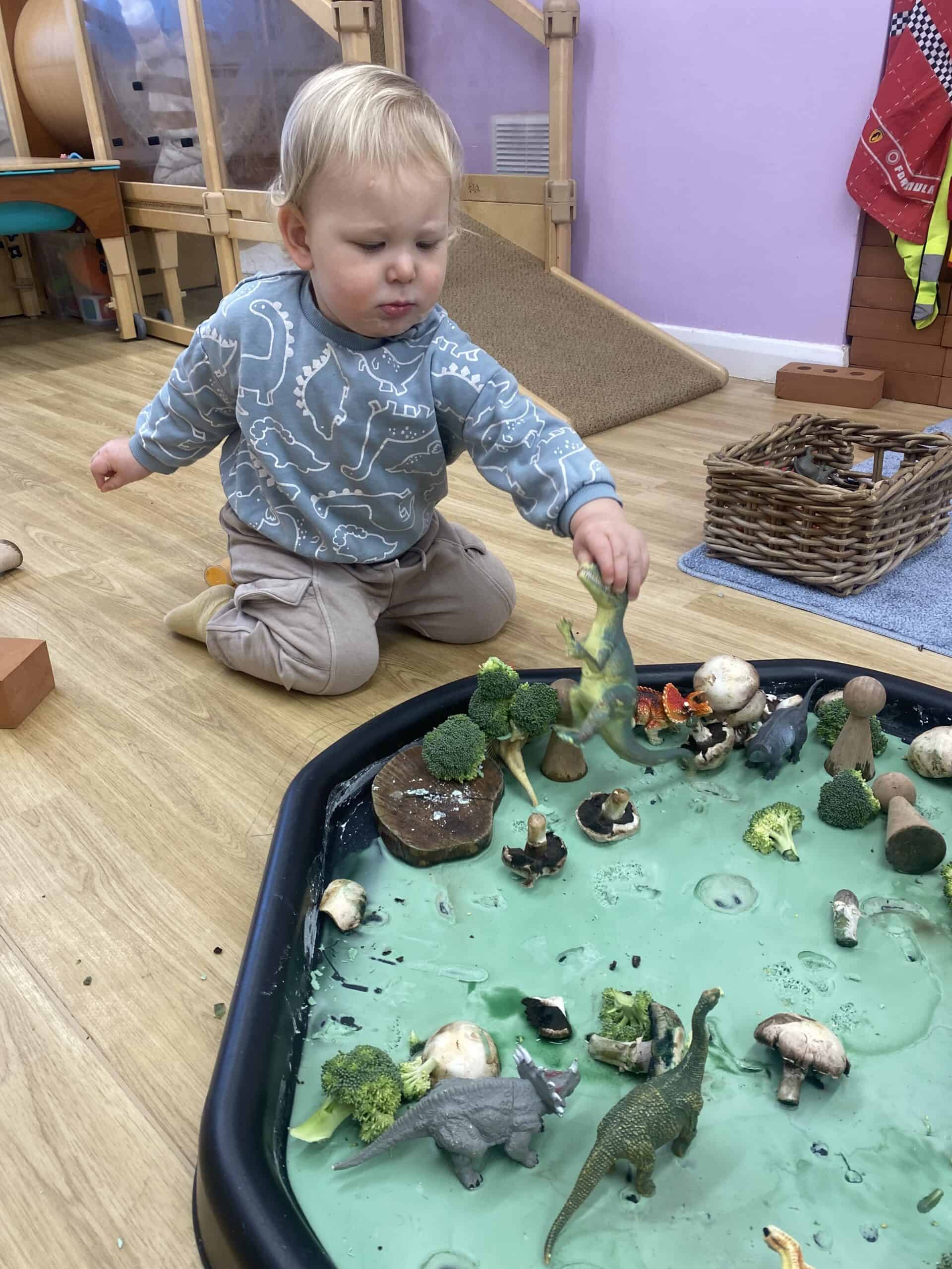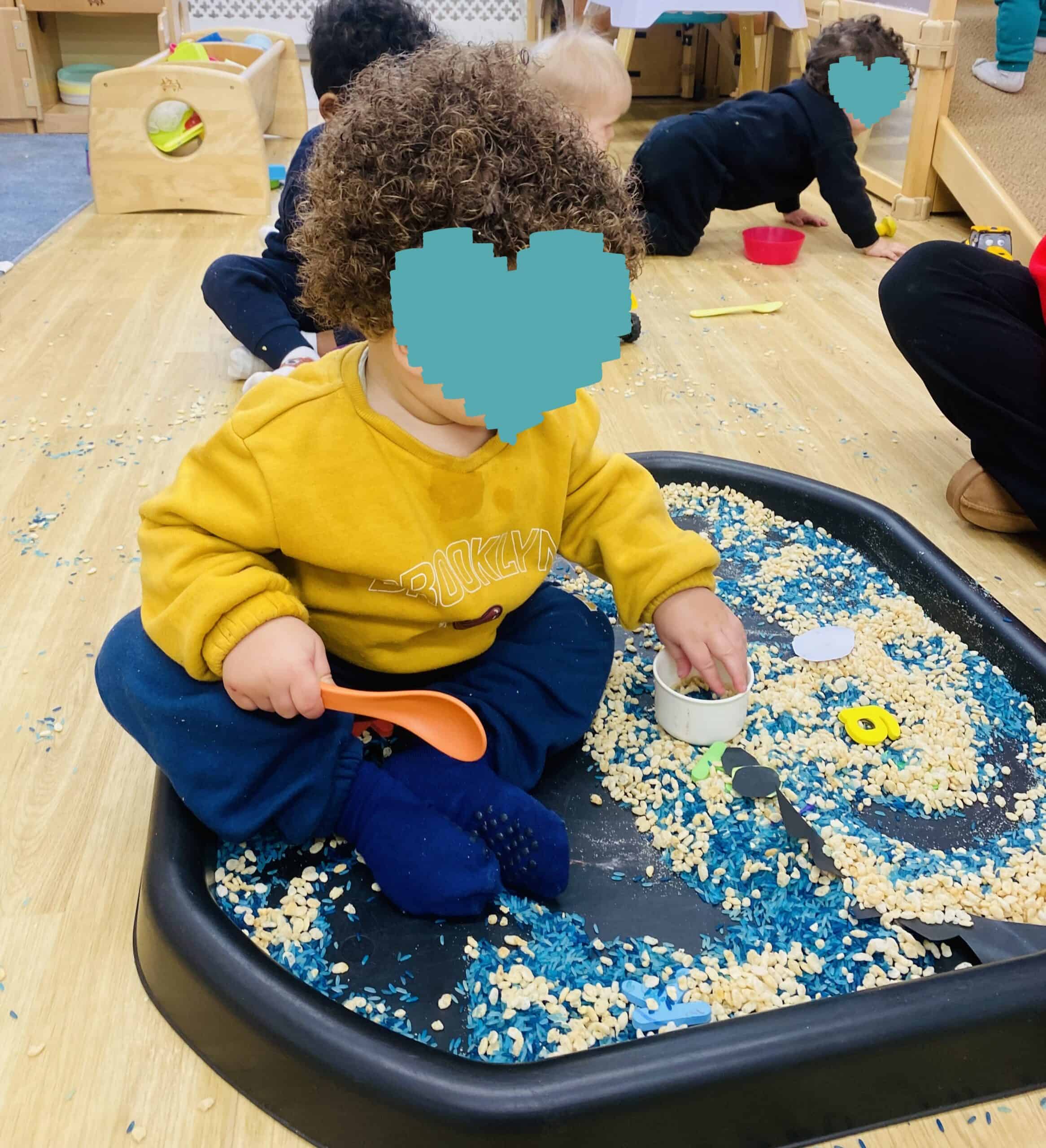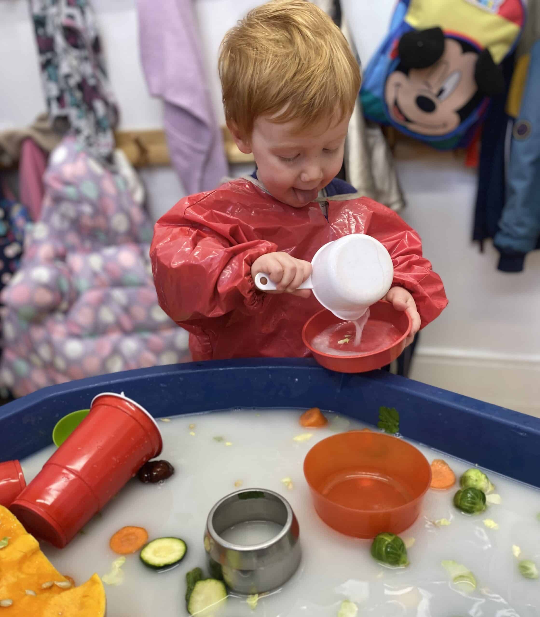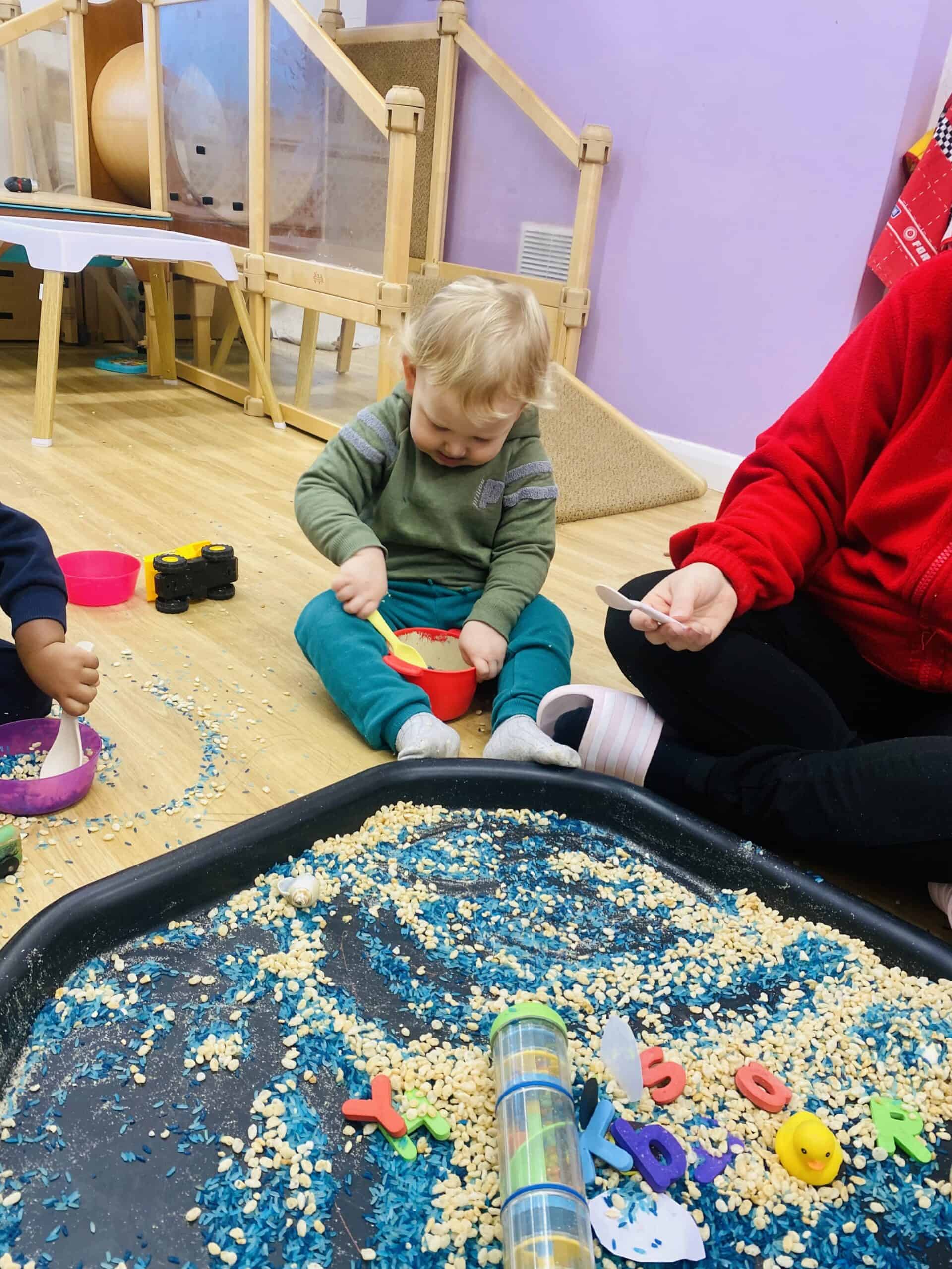 You don’t need a nursery setup, water in the sink, yoghurt on a tray, or a pile of pasta can provide lots of sensory fun.