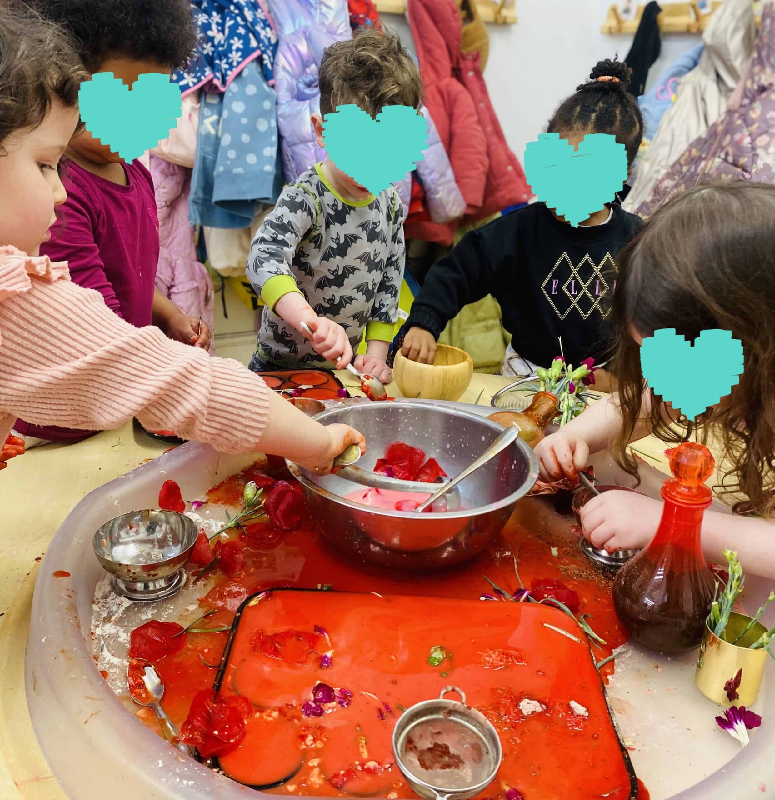 Messy play is all about hands-on exploration. Children get to squish, pour, mix, and create with things such as: